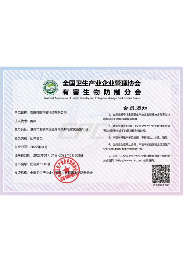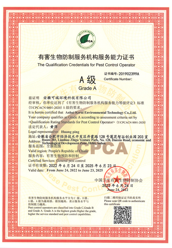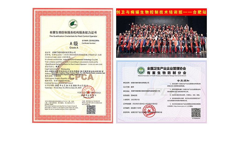 凱瑞蟲控?fù)碛匈|(zhì)量管理體系認(rèn)證、環(huán)境管理體系認(rèn)證、國家有害生物資質(zhì)等各項(xiàng)證書